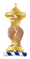 Λοφίο – Κορυφή: Σε υφασμάτινο στεφάνι Αζουρίτη και Λευκό ένα χέρι που κρατάει το Άγιο ποτήριο.